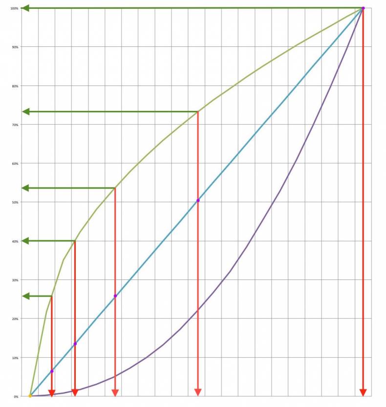 從上面的舉例來說,就能知道人眼對於明暗分布不是線性的,如果是線性的,暗室內只點開一盞燈,你應該只會覺得微弱的光亮,抑或是50盞燈又點開一盞燈,你會發覺確確實實的多了一盞燈的亮度。